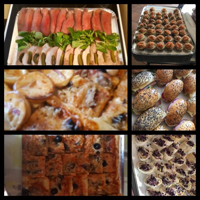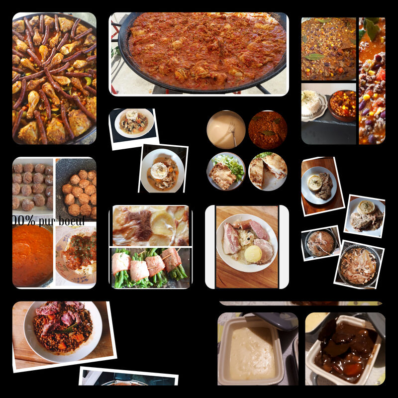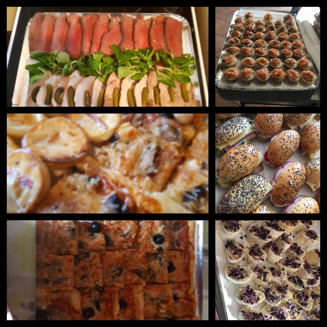 Tomates-mozza/taboulé/piémontaise/chili con carne-riz/trio de mini tartelettes au citron-framboise et far breton